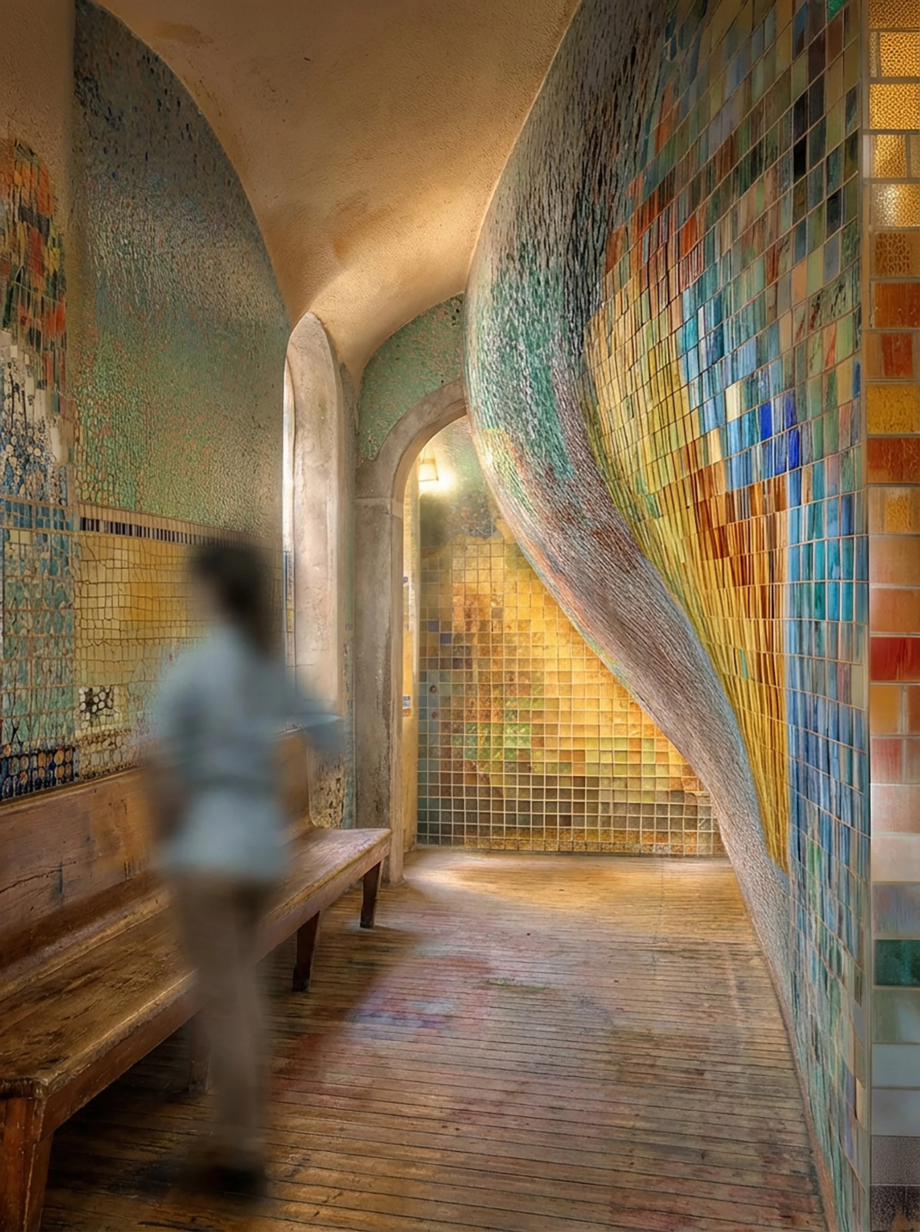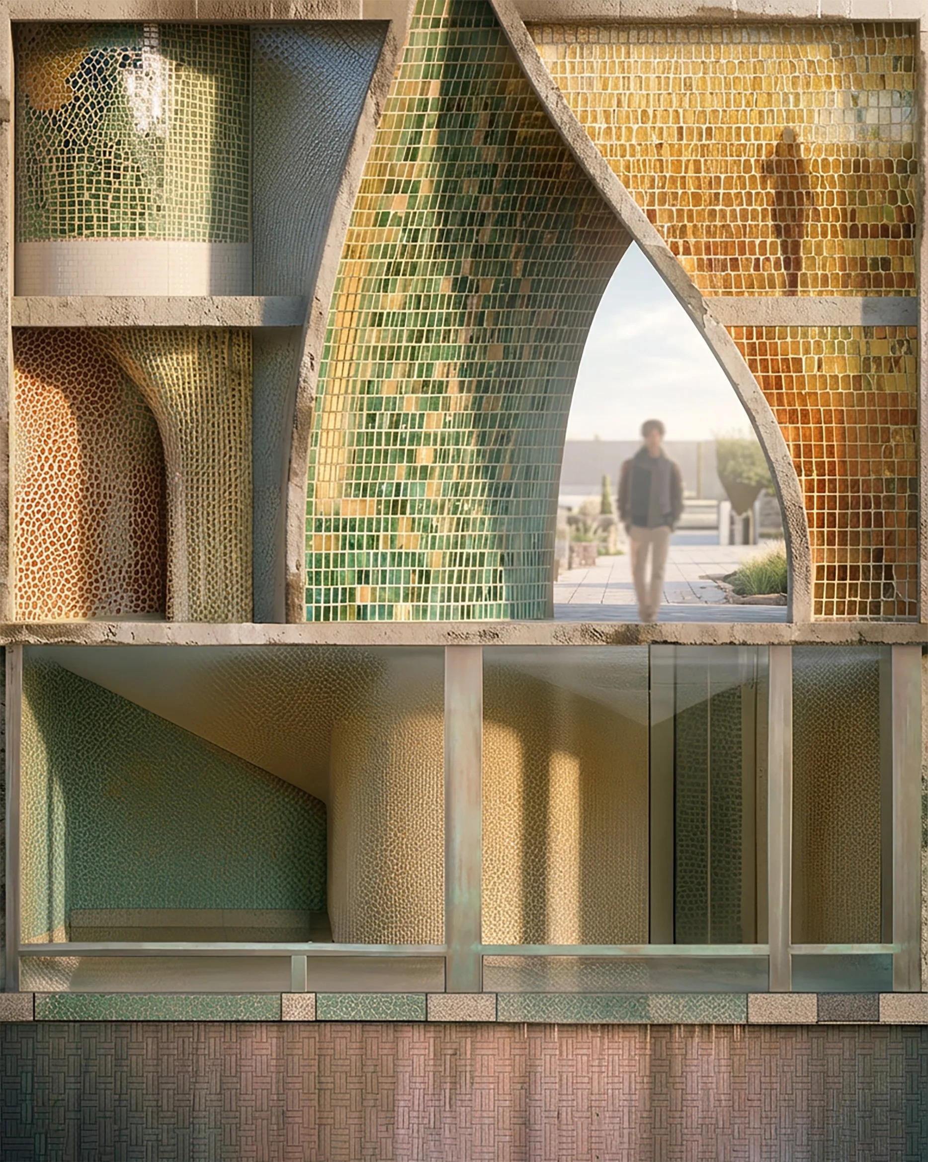 The operable clay tiles contribute both visually and functionally to the project’s architecture. These tiles create a multi-layered facade that shields the inner concrete panels from direct exposure and excessive solar heat gain, enhancing energy efficiency. The reflective steel panels behind the tiles further reduce heat load by reflecting sunlight or artificial light, while also adding dynamic visual appeal to the facade. The steel frame, anchored securely to the concrete layer, provides robust support for the entire facade system, ensuring both durability and aesthetic consistency.